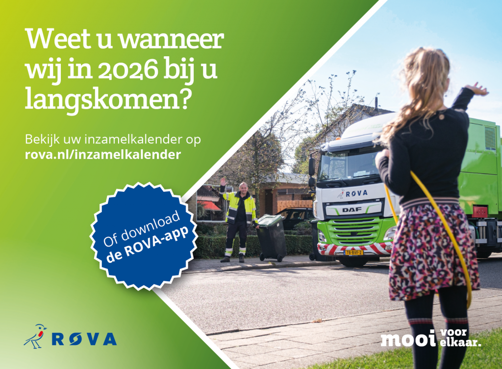 De inzamelkalender van ROVA voor 2026 is online beschikbaar. Bekijk via de ROVA-app of via www.rova.nl/inzamelkalender wanneer wij in 2026 in uw straat langskomen om afval en grondstoffen in te zamelen. Als u vragen heeft, kunt u contact opnemen met het ROVA-Klantcontactcentrum, via (038) 427 37 77 of kijk op www.rova.nl/contact.