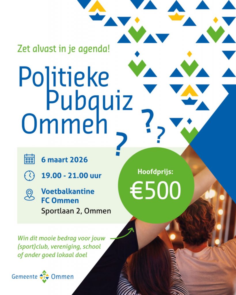 Het prijzengeld van €500,- is bedoeld om te schenken aan een vereniging, stichting, school of andere organisatie die zich inzet voor een maatschappelijk doel en is niet bestemd voor persoonlijk gewin of commerciële activiteiten. Winnen jullie als team de Politieke Pubquiz Ommen? Na afloop vragen wij om de betaalgegevens van deze organisatie, waarna de gemeente Ommen de uitbetaling verzorgt.