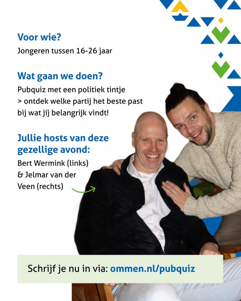 In de voetbalkantine van FC Ommen ga je samen met je team de strijd aan in een pubquiz met een politiek tintje. Tijdens de quiz maak je op een leuke en laagdrempelige manier kennis met de lokale politiek en ontdek je welke politieke partij het beste past bij wat jij belangrijk vindt. Raadsleden doen mee en gaan graag met jullie in gesprek > geen saaie speeches, maar gewoon gezellig aan tafel. Jullie hosts van deze gezellige avond: Bert Wermink en Jelmar van der Veen.