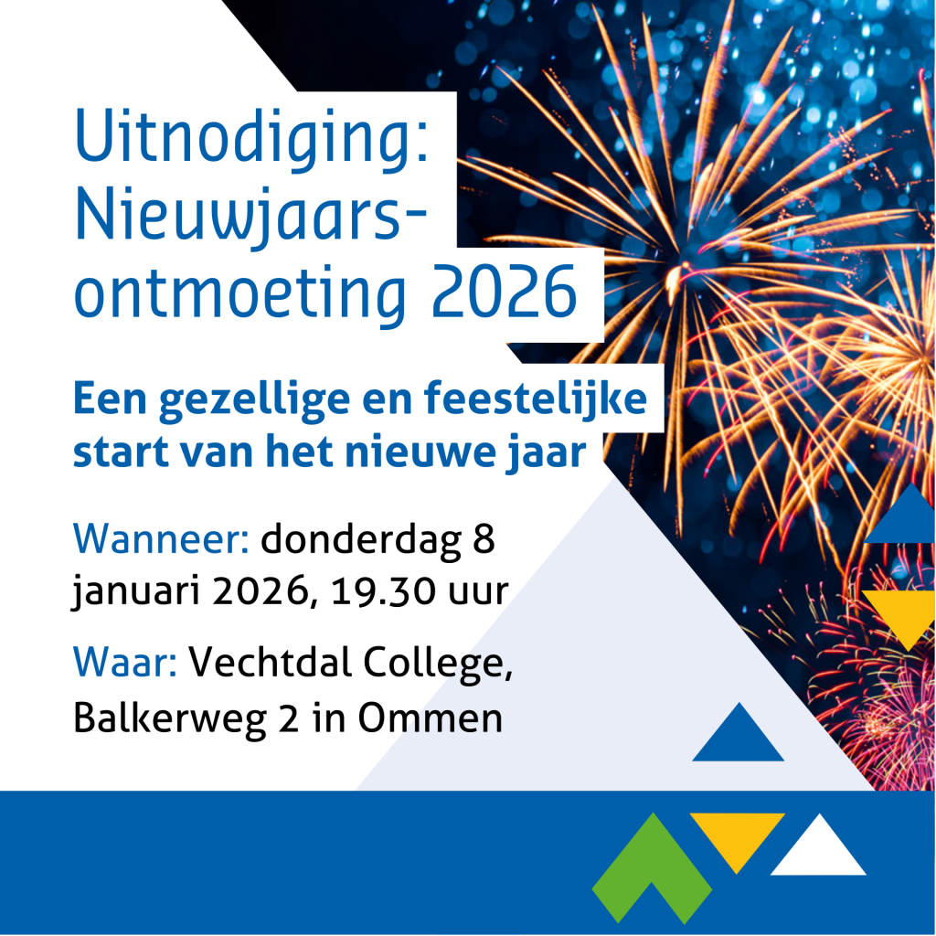U bent van harte uitgenodigd voor de nieuwjaarsontmoeting op donderdag 8 januari. Samen met u willen we terugkijken op 2025 en 2026 goed beginnen. U bent welkom vanaf 19.30 uur bij het Vechtdal College. Het programma start om 20.00 uur. Vanaf 20.30 uur is er alle tijd en ruimte om mede-inwoners te ontmoeten onder het genot van een hapje en drankje.