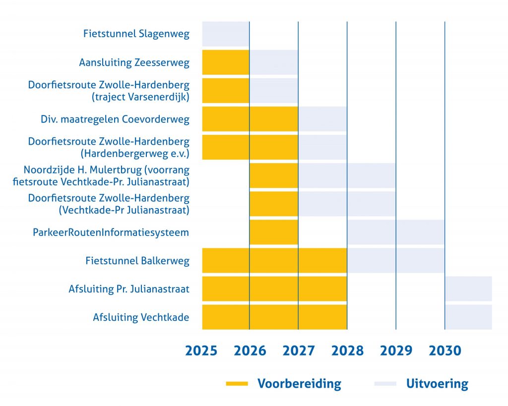 De realisatie van de nieuwe verkeersstructuur is een meerjarenproject. De verwachting is dat de voorbereiding van het hele maatregelenpakket minimaal 2,5 tot 3,5 jaar duurt. Dit heeft voor een belangrijk deel te maken met de huidige stikstofregels. Op dit moment is het onduidelijk wanneer Nederland van het ‘stikstofslot’ afkomt. Daarnaast speelt de latere aanleg van de tunnel bij de Balkerweg een rol.